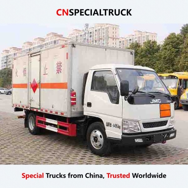 华通牌 HCQ5042XRQJX6ZH 型易燃气体厢式运输车,采用江铃 JX1041TCD26 国六底盘,专为危险品运输设计,适用于易燃气体(2.1类)及非易燃无毒气体(2.2类)的独立容器运输。车厢顶部密封不可开启,侧板厚度1.2mm、底板3mm,采用 Q235 碳钢复合材料,配备 ABS、防爆胎应急装置、导静电带、液压尾板可选、限速装置及卫星定位行驶记录仪,保证运输安全和作业效率,同时支持多样化可选配置。